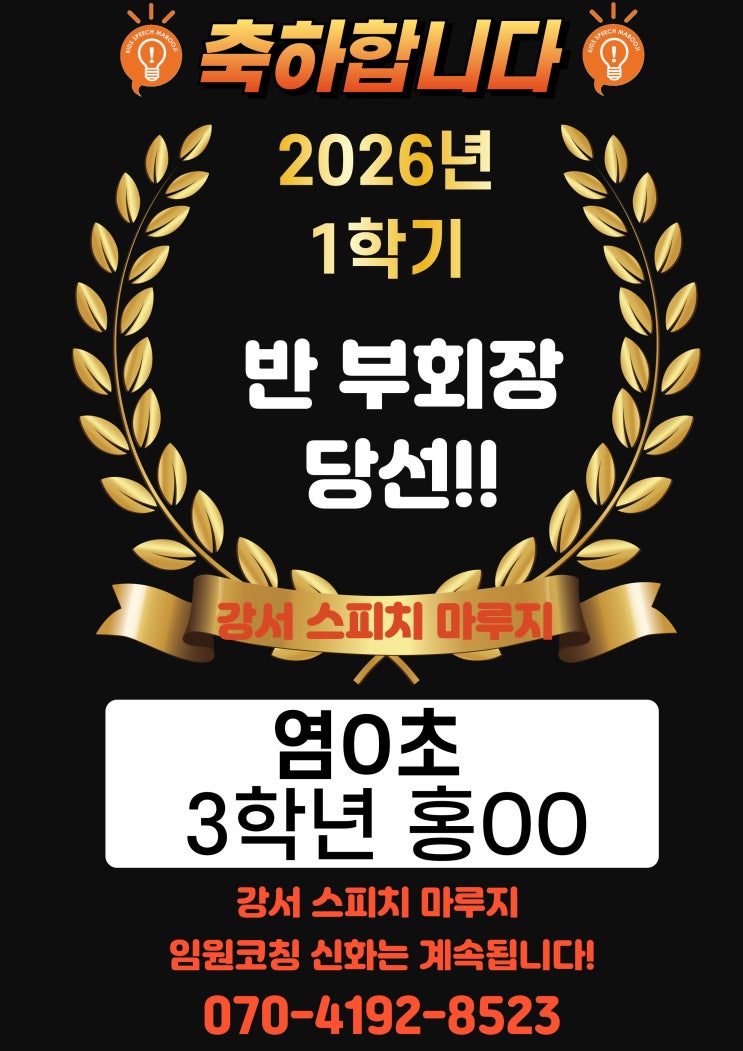안녕하세요~~ 오랜만에 돌아온 강서 스피치의 선두주자! 강서 스피치 마루지의 마스코트~ 마루입니다^^ 역시 스피치 마루지 강서점에는 자신감 있고 도전 정신이 좋은 친구들이 많네요~ 계속 이어지는 임원 당선 소식입니다! 모두 함께 축하해 주세요! 홍 00 친구는 처음 강서 스피치 마루지에 왔을 땐 소리도 크지 않고 시선도 불안정하여 자신감이 필요한 친구였습니다. 하지만 꾸준히 수업을 듣고 강서 마루지 발표회도 참여해 보면서 소리도 커지고 표현력도 좋아져서 자신감이 눈에 띄게 좋아졌습니다. 그리고 용기 있게 임원선거에 도전하여 이렇게 멋진 결과물을 만들어 내었답니다. 앞으로 홍 00 친구의 멋진 임원 활동을 진심으로 응원....... <img src="https://blogthumb.pstatic.net/MjAyNjA0MDNfMjI5/MDAxNzc1MTQyNDA4MTU3.3WV73rBr_kq0KuKUmiGjksChR_lZBTQzi6DYcrU2sYMg.bYByQT5rqmtsG8HY8KTNccClTjhEBmzH6dZPQH4GuB4g.JPEG/%C8%AB%C1%D8%C8%F1%B4%E7%BC%B1-001.jpg?type=s3" />