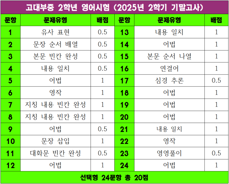 고대부중 2학년 영어시험 (2025년 2학기 기말고사)