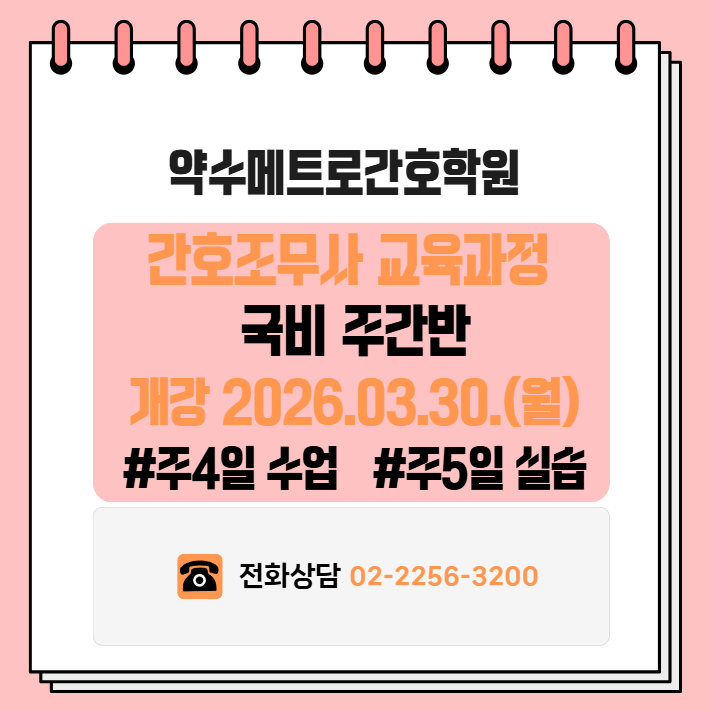 안녕하세요~ 어느덧 오늘이 2026년 2월 마지막 날이네요~ 올해 1/6이 벌써 훌쩍 지나갔습니다! 다들 올해 초에 세우셨던 계획이 있으시다면 잘 진행하고 계시나요? 잘 진행하고 계신다면 계속 꾸준하게 이어서 하시면 되시고 아직 특별한 계획이 없으시거나 이제라도 시작하신다면 아직 5/6이 남아있사오니 충분히 원하시는만큼 이루실 수 있으시기를 바라겠습니다! 약수메트로간호학원에서도 봄학기 3월을 맞이하여 국비 간호조무사 교육과정 주간반이 개강합니다. 주4일 이론, 주5일 실습으로 진행되시는 반이시구요~ 내년 상반기부터 의료기관으로 취업을 희망하신다면 올해 상반기 3월부터 간호조무사 자격증 취득과정을 시작해보시면 어떠실....... <img src="https://blogthumb.pstatic.net/MjAyNjAyMjhfMjc0/MDAxNzcyMjQyODgxMDg4.8qkdSjfDO21YGwhv4mtjz7xWqPR8BZSfD28DnuWmuucg.Rt3WhgYUK6-1JQd6w0ThGo5h3fSjW8ZUijRxvgcHa4kg.PNG/%BE%E0%BC%F6%B8%DE%C6%AE%B7%CE%B0%A3%C8%A3%C7%D0%BF%F8-%B1%B9%BA%F1_%B0%A3%C8%A3%C1%B6%B9%AB%BB%E7_%B1%B3%C0%B0%B0%FA%C1%A4_03.30._%B0%B3%B0%AD-1.png?type=s3" />