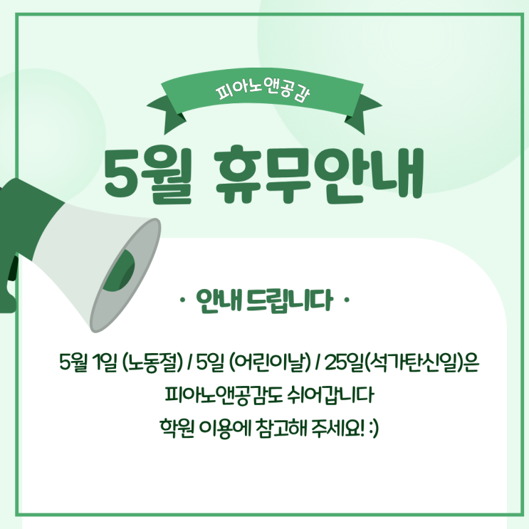 안녕하세요~ 피아노앤공감 입니다! :) 5월은 '가정의 달'로 휴무일이 정말 많은 것 같은데요! 다들 가족분들과 즐거운 5월 보내세요! 5월 1일 (노동절) 5월 5일 (어린이날) 5월 27일 (석가탄신일)은 피아노앤공감도 쉬어가며, 5월 2일 (토요일) 5월 4일 (월요일)은 정상 운영됩니다! 학원 이용에 참고해 주세요! :) 평일 : 11:00 ~ 22:00 토요일 : 11:00 ~ 17:00 (일요일, 공휴일 휴무) <문의> 카카오 : nnngonggam 인스타 : nnngonggam 상담문의 : 010 7532 1034 <img src="https://blogthumb.pstatic.net/MjAyNjA0MjdfMjA0/MDAxNzc3MjcxNDE2MDk1.Y_q_RigQNr3B0Dv5n69sRp0F_GU2S09r8nhOlKYtd8Qg.yHBUYERlWTec-vcDiWG-ghyim3hv0XUh9Qa9FEDgiygg.PNG/1.png?type=s3" />