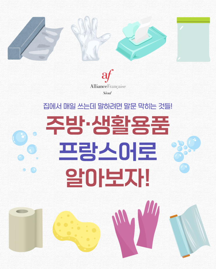 이거 프랑스어로 뭐였지…? 집에선 매일 쓰는데 말하려면 말문 막히는 그 물건들! 물티슈, 고무장갑, 수세미, 키친타올 등 주방·생활용품을 프랑스어로 한 번에 정리해봐요! <img src="https://blogthumb.pstatic.net/MjAyNjAyMDRfMjg3/MDAxNzcwMTY4ODk0MDU2.BwrnAgy36pTY_H-OsevvWkx1TPX9JST77j8NCskG600g.PIXmYHhvyaTOen6E9Hm99zpp1YcrauFujnOnNygfNkQg.PNG/KakaoTalk_20260204_103234481.png?type=s3" />