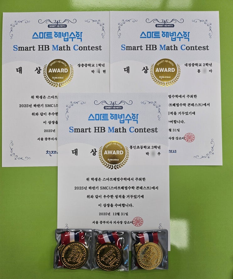 안녕하세요 신당 삼성아파트 정문상가에 위치한 삼성플러스해법학원 원장 정효순입니다. 오늘은 지난 2025년 하반기 한양대에서 치룬 SMC해법수학학력평가 수상 소식을 가지고 왔습니다! 2025 하반기 SMC (Smart HB Math Contest) 수상자 안내 이번 SMC 대회를 통해 아이들이 스스로의 실력과 가능성을 다시 한 번 확인할 수 있는 소중한 시간이 되었습니다. 결과도 물론 의미 있지만, 끝까지 집중하며 도전해 준 모든 과정이 무엇보다 값진 경험이었다고 생각합니다. 수상한 학생들 모두 진심으로 축하하며, 이번 경험이 앞으로의 학습에 더 큰 자신감과 동기부여로 이어지길 바랍니다. 앞으로도 아이들의 성장을 함께 응원하겠습니다 https://b....... <img src="https://blogthumb.pstatic.net/MjAyNjAxMjhfMjIw/MDAxNzY5NTk0ODA1MTg4.ZtsmgX8MrIwWShGgGw4_L1cJBICa3T00BvsP-jbuFs0g.590Yz8jFUgrs3V378yknQI7WQPMYsI5Jp4_VwI_f-REg.JPEG/KakaoTalk_20260128_185608256.jpg?type=s3" />