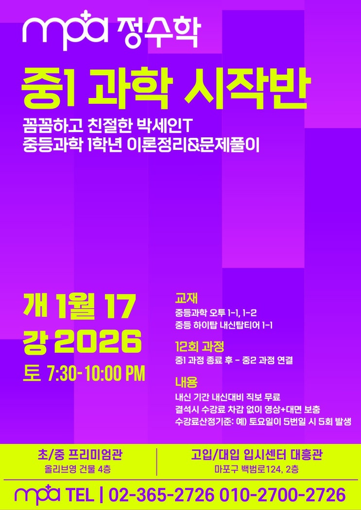 중학교 입학을 앞두고 과학 과목이 걱정되는 학생들이 많을 텐데요 초등 과학과는 난이도가 정말 달라지는 중1 과학 커리큘럼 용어도 어렵고, 실험도 복잡하고 어디서부터 시작해야 할지 감이 안 잡혀요 많은 학생들이 중등 과학을 앞두고 이야기합니다. 그래서! mpa정수학 과학에서 중1 과학 시작반이 열렸습니다. 12회 만에 완성되는 과학 개념 개강: 1월 17일 시간: 매주 토요일 7:30PM ~ 10:00PM 장소: mpa 초/중 프리미엄관 (올리브영 건물 4층) 12회 집중 수업으로 중1 과학 마스터! 수업이 끝나면 중2 과정으로 자연스럽게 연결됩니다 사용 교재 중등과학 오투 1-1, 1-2 중등 하이탑 내신탑티어 1-1 전범위 정복하고....... <img src="https://blogthumb.pstatic.net/MjAyNjAxMjhfMjQ4/MDAxNzY5NTczNTc3MTg1.sylbsbEg3YquaDgs8wp1SA2dAH-yW4XPssZ2YH3uD4Qg._H1M5-qhijZWJNMqWINZDGpoA1Qgy3ygXg6lTtu1M-Eg.JPEG/%C1%DF1%B0%FA%C7%D0%BD%C3%C0%DB%B9%DD-_%BA%B9%BB%E7%BA%BB.jpg?type=s3" />