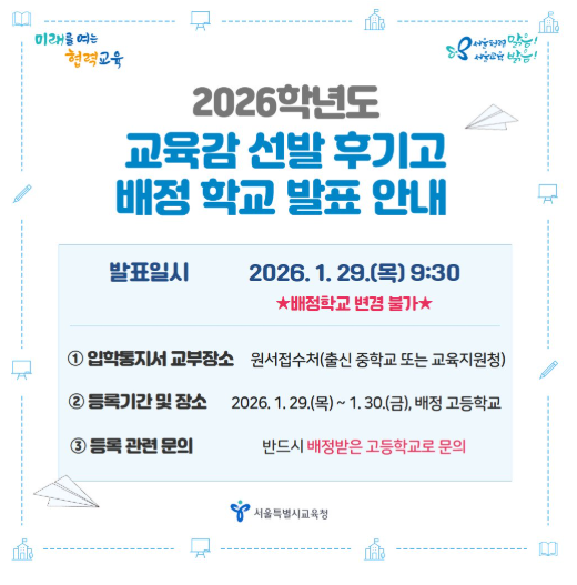 2026학년도 서울 교육감 선발 후기고 배정 결과 발표 안내(2026.01.29)