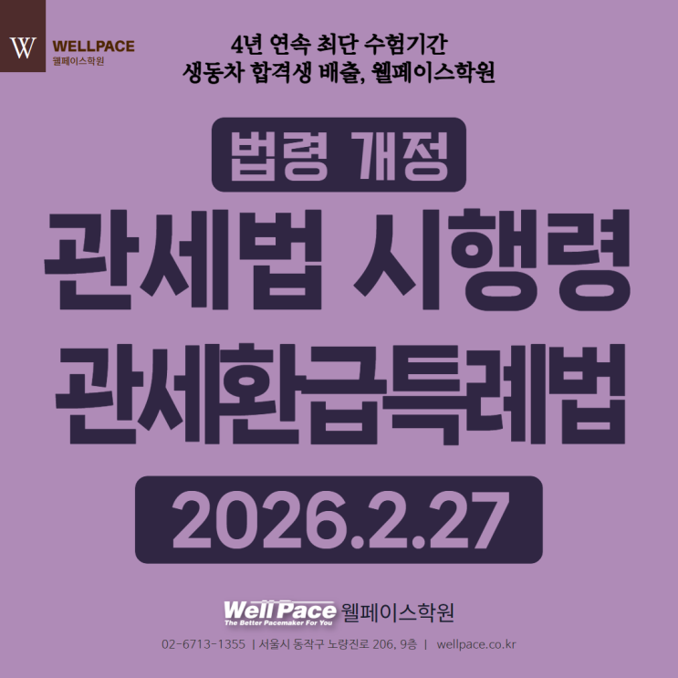 관세사 1차 시험이 2주일 정도 남은 시점에 관세법 시행령이 개정되었습니다. 관세사 2차 시험에 있는 관세환급특례법 시행령도 같이 개정되었기에 반영해 주셔야 합니다. 관세사 시험에서 '법률․회계처리기준 등을 적용하여 정답을 구하여야 하는 문제는 “해당 시험일” 현재 시행중인 법률․회계처리기준 등을 적용하여야 함'이라고 시험 공고문에 게시되어 있습니다. 따라서, 개정된 법령 중에서 관세사 1차 시험은 4.1 이후에 시행되는 법령은 개정 전 법령으로 공부하셩되고, 관세사 2차 시험은 7.1 이후에 시행되는 법령은 개정전 법령을 기준으로 공부하셔야 합니다. 이번에 개정된 관세법 시행령과 관세환급특례법 자료는 아....... <img src="https://blogthumb.pstatic.net/MjAyNjAyMjhfMjcz/MDAxNzcyMjQwNTE1OTU5.BugCNbb_cYj_bHapTYJ2YAdDHgjBbPzcjk1vDGXnhPsg.QKq2N7NOokBOz25uvO3hX6g1HwjnJV9fyYrxplTRnD0g.PNG/%BA%ED%B7%CE%B1%D7_25%B3%E2_5%BF%F9_%284%29.png?type=s3" />