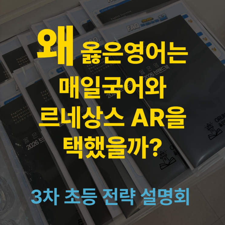 안녕하세요, 옳은영어 입니다. 26년 2월 5일, 드디어 제 3차 초등 전략 설명회가 열렸습니다. 설명회 전, 학부모님들과 담임선생님이 얼굴을 마주하고 훈훈한 인사도 나누었습니다 그동안 12월, 1월에 1차와, 2차를 거쳐 많은 학부모님들의 관심을 받아 3차까지로 이어진 전략 설명회는 2032 대입 개편 내용 및 그에 대한 전략과 26' 3월 학기 옳은영어의 문해력 강화 프로그램, 그리고 초등부 커리큘럼 소개로 영양가있는 고퀄리티의 시간으로 진행되었습니다. 매 설명회마다, 다 같은 내용이 아닌,, 새로 업데이트 된 교육 정보를 알짜배기로 들을 수 있는 정말 귀한 시간이었는데요~! 핵심만 뽑아 다시금 정리해드리겠습니다! 3차 전....... <img src="https://blogthumb.pstatic.net/MjAyNjAyMTFfMTkx/MDAxNzcwNzkyNDM5NjA2.ZmiayYTjxh_z_Lzhcd6fW8CsBDpyXojK-f8Ab-pFr0Ag.8cUezZ7f0xOSh6RQAQljlk4gWkBAKE9hkVutSZCq1Zwg.PNG/%C1%A6%B8%F1%C0%BB_%C0%D4%B7%C2%C7%D8%C1%D6%BC%BC%BF%E4..png?type=s3" />