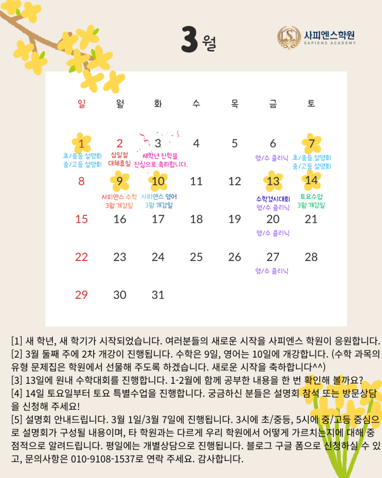 [신대방삼거리 수학/영어 전문학원] 사피엔스학원 3월 일정표