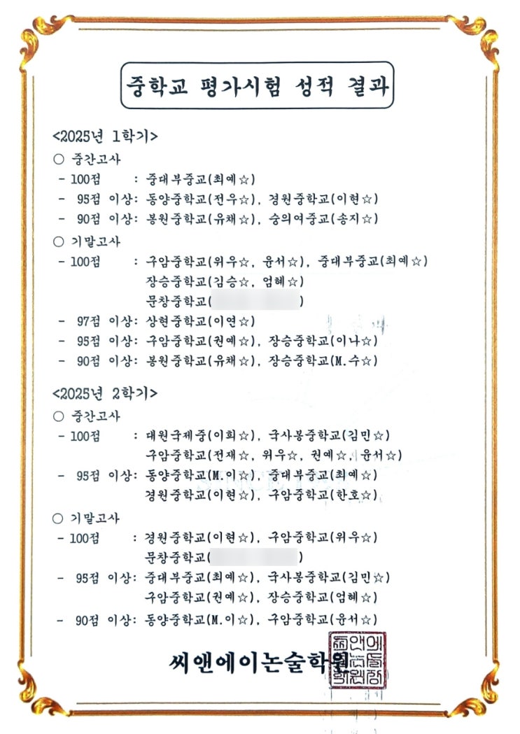 씨앤에이논술 상도점 2025년 중학교 내신 성적 결과입니다.