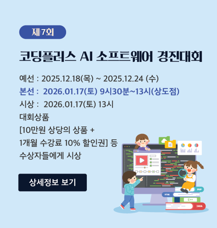 제5493호, 제3398호 매년 1회 실시하고 있는 코딩플러스 경진대회가 제 7회를 맞았습니다. 학생들에게 동기부여가 되고 실력을 검증하는 좋은 기회가 되고 있는만큼, 많은 참여 부탁드립니다. 코딩플러스 학원 재원생이 아니어도 참여가능합니다. 도전해 보세요. <img src="https://blogthumb.pstatic.net/MjAyNTEyMDNfMTYy/MDAxNzY0NzU3NTYyNTIz.LT9wPXQQjLwxrKuN0SOoqT2EFkARuQgQhnuoa9Sa3Dgg.-5Vg6ir_evIQn73CQAk2rnmuzbPkzx-Adfun9nFRyE8g.PNG/%B1%D7%B8%B21.png?type=s3" />