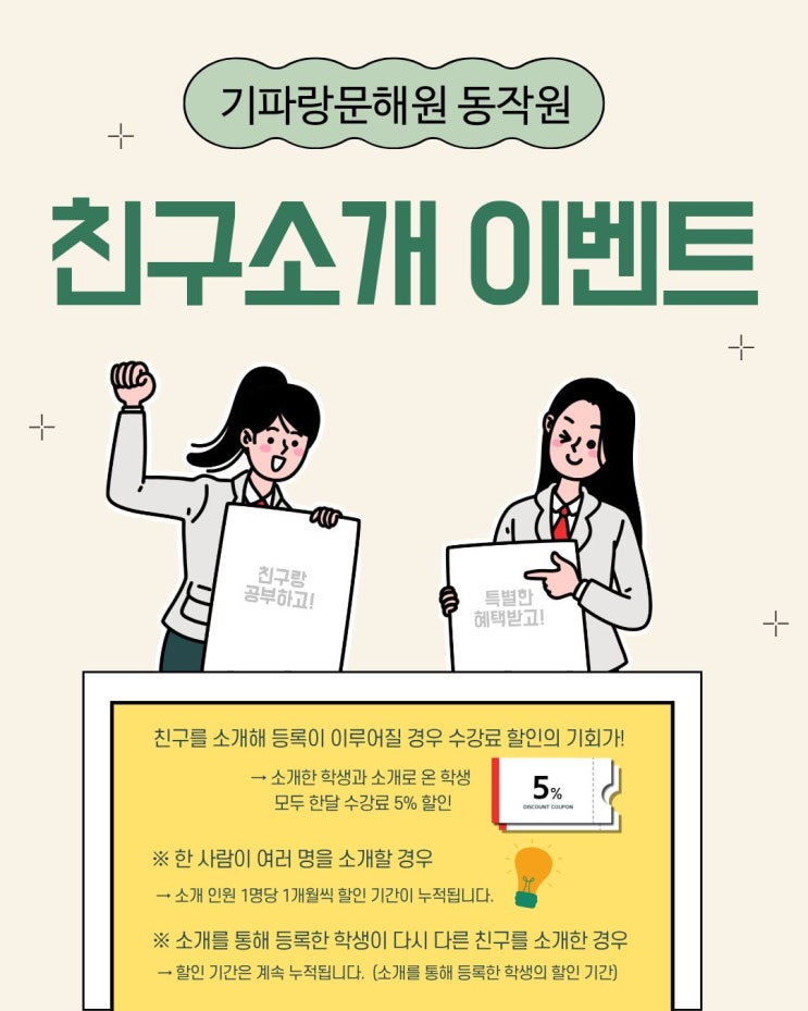 안녕하세요 기파랑문해원 동작원입니다. 요즘 학부모님들 사이에서 자주 들리는 소식! 기파랑의 신뢰 있는 수업과 분위기가 퍼지고 있습니다. 수업 방식과 운영에 대한 믿음과 만족이 차곡차곡 쌓인 결과이며, 학부모님 소개를 통해 문의가 이어지는 경우도 늘고 있습니다. 이러한 흐름에 맞춰 저희 기파랑에서는 학부모님들의 믿음이 자연스럽게 이어질 수 있도록 친구소개 이벤트를 함께 진행합니다. ★ 친구 소개 이벤트 ★ 혜택 친구 등록 시 소개한 학생 + 신규 학생 모두 한 달 수강료 5% 할인 교재비 제외 할인 누적 한 사람이 여러 명 소개 → 소개 인원 1명당 1개월씩 할인 누적 소개받은 친구가 또 다른 친구를 소개해도 할인 기간....... <img src="https://blogthumb.pstatic.net/MjAyNjAxMjVfMTc0/MDAxNzY5MzMxOTI0NjM5.aOt-mz28KPOuW-NeHCIOqbTaYdHNvUb_BIltrbUbYqEg.3LJvJMBPHGVZPX24WDaNvDDUY5vDDFkTRgHrYFoeapUg.JPEG/%BB%F5%C7%D0%B1%E2_%B5%EE%B7%CF_%C0%CC%BA%A5%C6%AE.jpg?type=s3" />