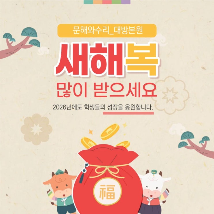 안녕하세요. 문해와수리_대방본원입니다. 희망으로 가득한 2026년 새해가 밝았습니다. 새로운 한 해를 맞이하며, 학생 여러분과 학부모님 가정에 건강과 행복이 가득하시길 진심으로 기원드립니다. 지난 한 해 동안 보내주신 믿음과 응원에 깊이 감사드립니다. 학생들의 성장과 변화를 가장 가까이에서 함께할 수 있었던 시간은 저희에게도 매우 소중하고 의미 있는 시간이었습니다. 2026년에도 문해와수리_대방본원은 아이들이 스스로 생각하고, 이해하고, 성장할 수 있도록 더욱 정성껏 지도하겠습니다. 단순한 진도와 결과를 넘어, 배움의 과정 속에서 자신감과 성취의 기쁨을 느낄 수 있도록 늘 곁에서 함께하겠습니다. 새해에는 새로운 목표....... <img src="https://blogthumb.pstatic.net/MjAyNjAyMThfMjgx/MDAxNzcxMzkxMjA4MjA2.na2G7NfVyb07mw_nj3MjYbvnJzj15MOezTLJqbjzkIgg.Lx89GNYTUODDd3Y2u86gt_aDP2AQ-MV-3ENHBymWaTAg.JPEG/1.jpg?type=s3" />