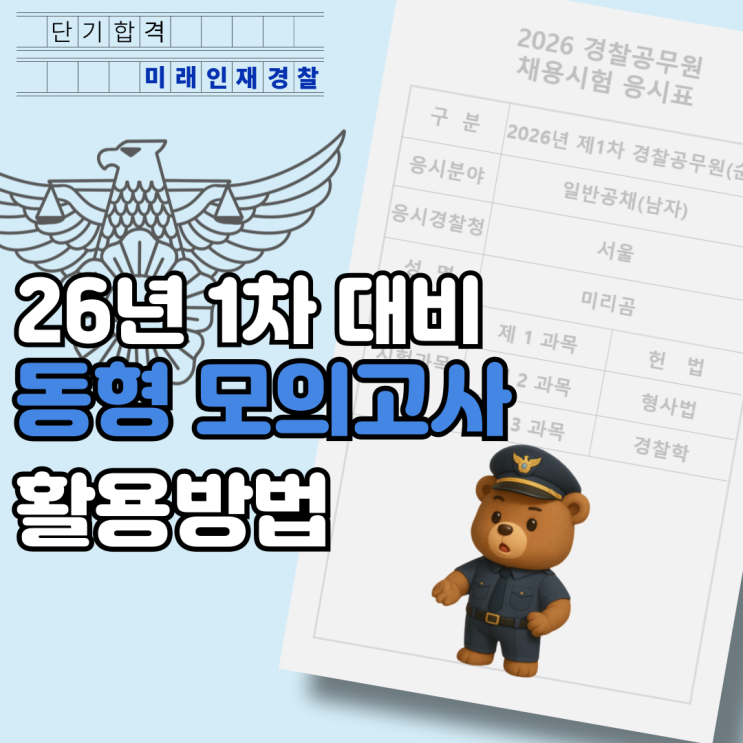 안녕하세요. 미래인재경찰학원입니다. 26년 1차 경찰시험일까지 이제 얼마 남지 않았습니다. 지금 시점에서 가장 중요한 전략은 ❌ 새로운 내용을 무리하게 추가하는 것 ❌ 불안해서 문제만 마구 푸는 것 이 아닙니다. 지금은 기존에 알고 있는 내용을 최대한 많이 보고 문제풀이를 통해 실전 감각을 끌어올려야 하는 시기입니다. 경찰시험 막판, 가장 중요한 1~3개월 경찰시험 준비 과정에서 가장 중요한 시기는 바로 시험 1~3개월 전입니다. 이 시기에는 그동안 쌓아온 이론과 판례 지식을 문제풀이에 녹여내는 작업이 필요합니다. 그 핵심 도구가 바로 동형 모의고사입니다. 동형모의고사, 이렇게 활용해야 점수가 오....... <img src="https://blogthumb.pstatic.net/MjAyNjAxMzBfMjMw/MDAxNzY5NzU4NTc4MTY1.86sVa31R6LQDZfHyJsYwHpqxyvYCuu18YbVO4iFkknAg.ZS1EL6oYdvBDb3zsMNmZrh-gNOynVPI00XWCOFP2AKMg.PNG/001.png?type=s3" />