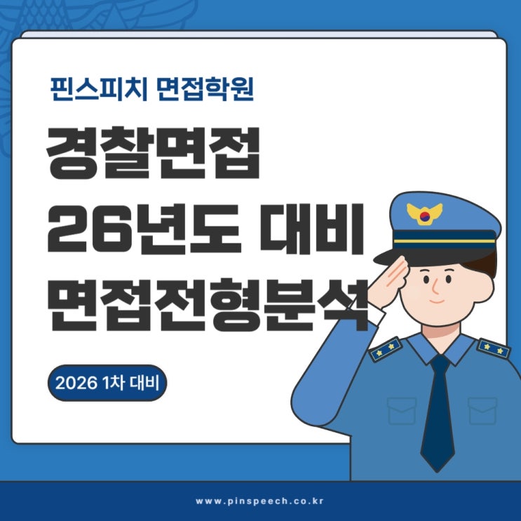 안녕하세요 핀스피치 학원입니다. 작년부터 집단면접이 폐지되고, 발표면접이 도입되면서 개별면접 형식으로 경찰면접이 전형도 바뀌고, 평가방법에도 변화가 있었습니다. 예전부터 단계적으로 면접전형을 바꿔가며, 경찰채용시험에서 면접 비중을 조금씩 늘리고 있는 추세입니다. 현재 경찰 채용시험에서 면접이 차지하는 비율은 25%입니다. 환산점수로 1배수에 들지 못하더라도 면접으로 뒤집을 수 있는 충분한 비율이기 때문에 필기시험 발표 이후, 체력시험을 준비하면서 경찰면접도 함께 준비하시는 것을 추천드립니다. 경찰면접 진행 절차 경찰면접시험은 발표면접과 개별(경험/인성)면접으로 구성되어 진행됩니다. 모두 하루에 진행되며, ....... <img src="https://blogthumb.pstatic.net/MjAyNjAzMTNfODcg/MDAxNzczMzkzNDI2NDQ4.-i7CLHre7p7jnaSTWjTo4zRSPS5w3bYn6sl47D0JUZsg.qN5aLkCGff_qAwA9pwwkAx5rxf9W2zODCPJp5fRXa5wg.JPEG/%B0%E6%C2%FB%B8%E9%C1%A2_%284%29.jpg?type=s3" />