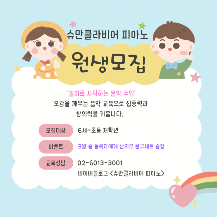 2026학년도 신입생 모집 안내 아이의 감성과 실력을 함께 키우는 피아노 시간 새 학년을 준비하는 요즘, “우리 아이, 무엇부터 시작하면 좋을까요?” 고민하시는 부모님들 많으시죠. 피아노는 단순한 취미를 넘어 집중력 · 표현력 · 자기조절력까지 함께 자라는 최고의 예술교육입니다. 슈만클라비어는 아이의 성향을 먼저 이해하고, 기초를 탄탄하게 다지는 정통 음악 교육을 지향합니다. 3월 중 등록한 친구 모두에게 산리오 문구세트를 증정합니다 그동안 배우고 싶었거나 처음 시작할 계획이 있는 친구들은 슈만클라비어 피아노로 오세요 이런 아이에게 추천합니다 • 음악을 좋아하지만 체계적으로 배워본 적 없는....... <img src="https://blogthumb.pstatic.net/MjAyNjAzMDNfODgg/MDAxNzcyNTE4Mzk5MTkw.oPow9sGINBw5kKhScrD9vmrwyX3v_B_ZCg-niOV5VCMg.rK1Sn-N9ysNm3BT7UscftpEJaUO2RINg0HdNPQN0gnog.PNG/%C7%CF%B4%C3%BB%F6_%B3%EB%B6%F5%BB%F6_%B1%CD%BF%A9%BF%EE_%C0%CF%B7%AF%BD%BA%C6%AE_%C0%AF%C4%A1%BF%F8_%B8%F0%C1%FD_%C0%CE%BD%BA%C5%B8%B1%D7%B7%A5_%C6%F7%BD%BA%C6%AE.png?type=s3" />