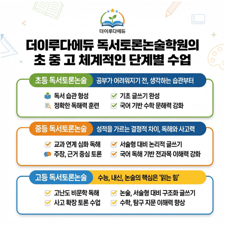 안녕하세요? 더이루다에듀 독서토론논술 학원 입니다 오늘은 더이루다에듀 독서토론논술학원의 일상 수업 모습을 소개해드리려고해요. 방학 특강 - 릴레이 책 읽기 방학 기간에는 릴레이 책 읽기 프로그램으로 진행됩니다. 책 읽는 양을 늘리는 것이 아니라 “읽는 즐거움”을 경험하게 합니다. 매일 꾸준히 읽고 토론하고 기록하고 방학이 끝날 때쯤이면 아이의 문장 길이와 생각 깊이가 달라져 있습니다. 실력이 쌓이는 방학, 이게 바로 방학기간의 더이루다에듀 수업일상입니다 읽는 힘부터 다릅니다 논술 학원을 찾는 학부모님들이 가장 많이 하시는 말이 있어요. “아이가 문제는 푸는데, 지문을 정확히 이해....... <img src="https://blogthumb.pstatic.net/MjAyNjAyMjJfMjY4/MDAxNzcxNjk2OTQ0MDE5.GL3pDM-HEgj3VSHsImjGhKnPsAemtr0BRUokZ5PSlp8g.M9ndJI2R4lZNChR_IQClfMnRemiyjbpONWp9uv04Yz4g.PNG/6.png?type=s3" />