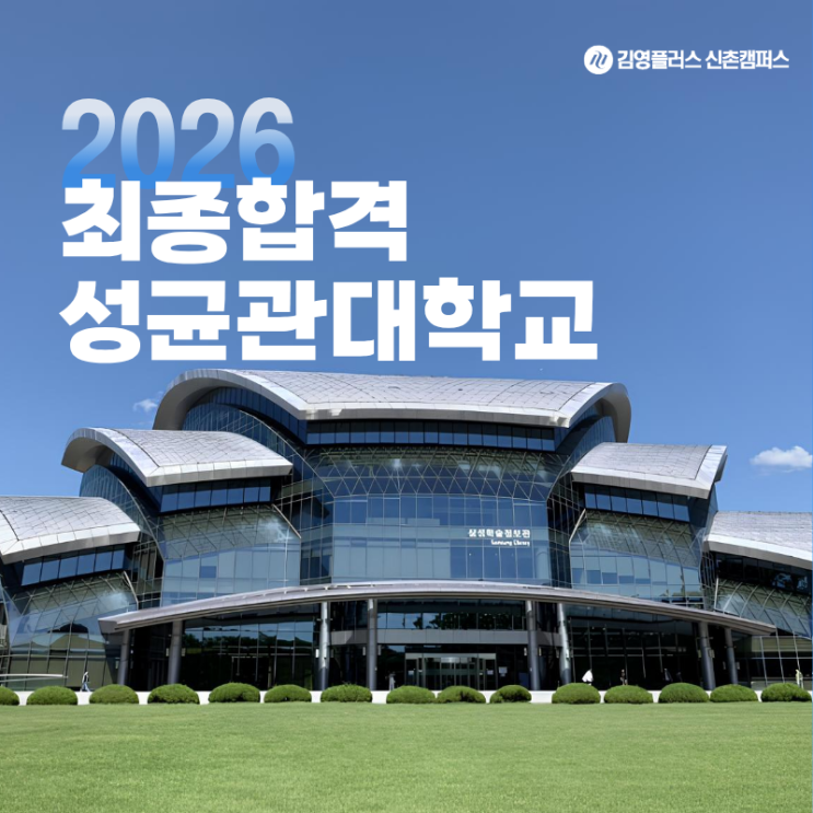안녕하세요. 서대문·신촌·마포·은평·홍대권 김영편입 신촌 플러스 + 김영플러스 신촌캠퍼스입니다. 신촌캠퍼스 학생들은 성균관대학교 어떤 학과를 합격했을까요? ※ 김영플러스 신촌캠퍼스 12월 유료 수강생 기준 ※ 복수합격자 포함 UPDATE. 20260223 기준 2026학년도 김영플러스 신촌캠퍼스 편입 최종합격 한문교육과 영어영문학과 컴퓨터교육과 중어중문학과 소프트웨어학과 시스템경영공학과 바이오메카트로닉스학과 기계공학부 전자전기공학부 물리학과 ※ 최초합격 및 추가합격 포함 합격의 흐름은, 신촌에서 시작됩니다 2026학년도 편입 전형에서 김영플러스 신촌캠퍼스 재원생이 성균관대학교 최종합격이라는 결과를 만들었습니다. 성균....... <img src="https://blogthumb.pstatic.net/MjAyNjAyMjRfMzkg/MDAxNzcxOTIyNzYzNTc0.YWvDcL-75PKc0hIJIQ6GAKJg21uex1vfyOBYU7v4Qmsg.HKoex4Fbhr0cvdAF2BybwY5A6cO8ne1_H2_ru2we3scg.PNG/%C1%A6%B8%F1%C0%BB_%C0%D4%B7%C2%C7%D8%C1%D6%BC%BC%BF%E4._%2812%29.png?type=s3" />