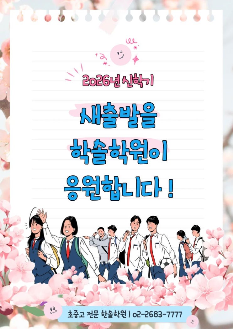 설렘 가득한 신학기, 우리 아이의 공부도 새롭게 준비할 시간입니다. 한솔학원은 아이 한 명, 한 명의 속도에 맞춰 기초부터 탄탄하게, 자신감까지 채워드립니다. ✔ 초등 – 상위권 진입을 위한 기초 심화 & 사고력 강화 ✔ 중등 – 시험 분석 기반 내신 1등급 대비 + 고등과정 선행 ✔ 고등 – 수시·정시 맞춤 전략 및 수능 집중 트레이닝 신학기는 1년 성적의 방향을 결정하는 중요한 시기입니다. "지금 시작해야 차이가 납니다." “시작이 다르면 결과도 다릅니다.” 2026년 3월 신학기 모집이 시작되었습니다. 미리 준비하는 학생이 앞서갑니다 한솔학원 초.중.고 상담문의 02-2683-7777 <img src="https://blogthumb.pstatic.net/MjAyNjAyMjdfMjM2/MDAxNzcyMTc5Nzc0NDYz.wx051TxrF8grSp2JEsivwxEbZO3b94bnlsyZoJUO7bwg.Q2ei9LXZ_89yfzaLLF1Trq0OrE9hBXFYKwHA0-207nAg.JPEG/%C1%A6%B8%F1%C0%BB_%C0%D4%B7%C2%C7%D8%C1%D6%BC%BC%BF%E4._%2823%29.jpg?type=s3" />