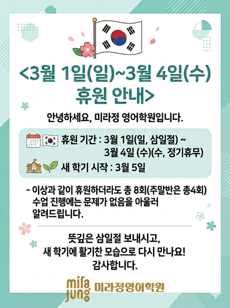 <3월 1일(일)~3월 4일(수) 휴원 안내> 안녕하세요, 미라정 영어학원입니다. 삼일절을 맞아 잠시 휴원합니다. - 휴원 기간: 3월 1일(일, 삼일절) ~ 3월 4일(수, 정기휴무) - 새 학기 시작: 3월 5일 - 이상과 같이 휴원하더라도 총 8회(주말반은 총4회) 수업 진행에는 문제가 없음을 아울러 알려드립니다. 뜻깊은 삼일절 보내시고, 새 학기에 활기찬 모습으로 다시 만나요! 감사합니다. <img src="https://blogthumb.pstatic.net/MjAyNjAzMDJfMTQg/MDAxNzcyNDU4Nzc2Mzgy.AxJfBpbbajgBhi0UVkKAtIuf8aWuurNr_1DGNB1XKukg.Q3GSDc0pj7MIzhOVYtcqHIBOKPlZ2cCLTWeOViiJJsQg.PNG/1772458623485.png?type=s3" />