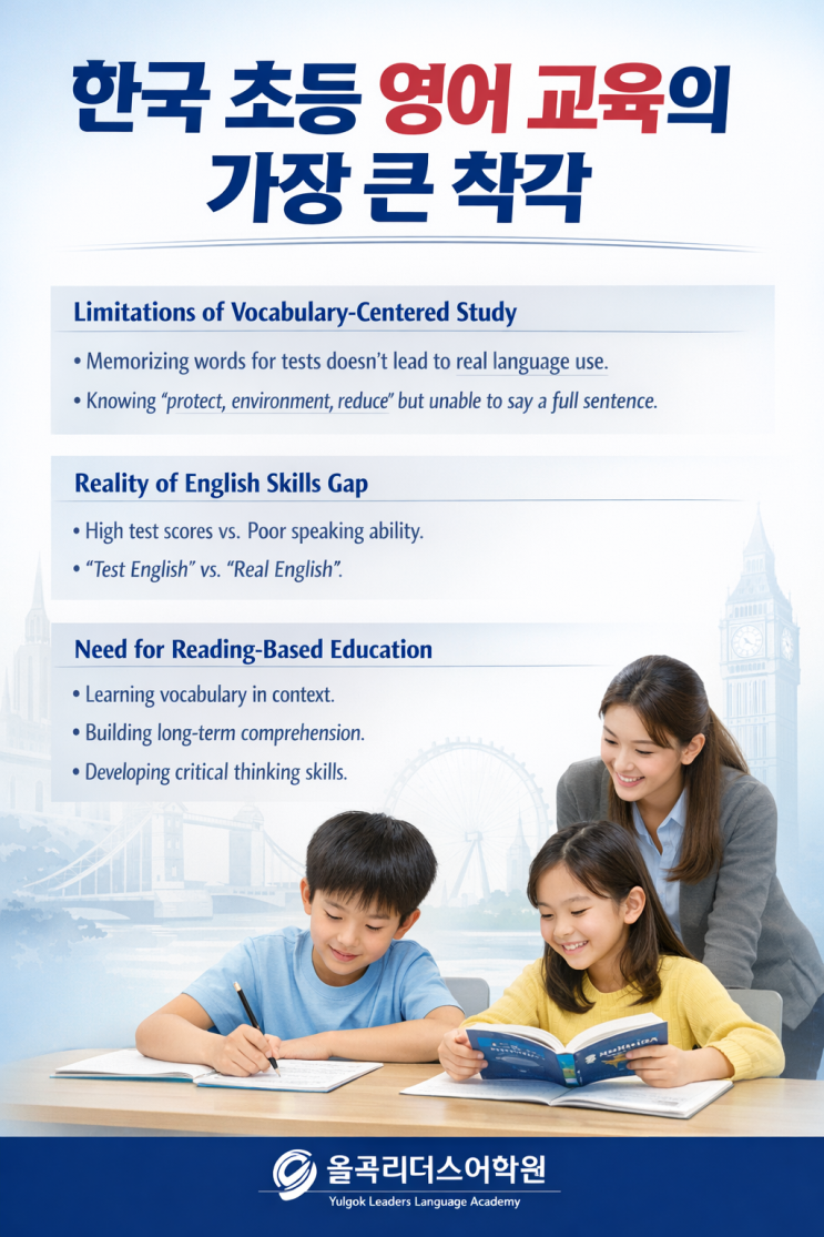 [교육 뉴스 | 율곡리더스어학원 찐대표] 한국 초등 영어 교육의 가장 큰 착각 최근 교육 현장에서 가장 많이 제기되는 질문 중 하나는 “왜 단어를 많이 외웠는데도 영어를 못할까?” 입니다. 이는 단순한 개인의 문제가 아니라, 한국 초등 영어 교육 구조에서 비롯된 대표적인 착각과 연결됩니다. 1. 단어 시험 중심 공부의 한계 현재 많은 초등 영어 교육은 ‘단어 시험’ 중심으로 운영됩니다. 매주 50~100개의 단어를 외우고 시험을 보는 방식입니다. 단기 성취감은 있지만, 이는 ‘암기된 지식’일 뿐 ‘사용 가능한 언어’는 아닙니다. 예를 들어, 학생이 *“environment, reduce, protect”*라는 단어를 모두 알고 있어도 “환경을 보호해....... <img src="https://blogthumb.pstatic.net/MjAyNjAzMThfMTky/MDAxNzczODA5MDAzODA3.mOKAOHTmzxKZMeM1cMYGwFJZcrysU_bDBQZLnKQ1NKUg.cLujZChl_TRjbYyzOEGAprjfY0hO_G7aFXtuU-IpqnUg.PNG/ChatGPT_Image_Mar_18%2C_2026%2C_01_42_30_PM.png?type=s3" />