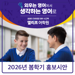 안녕하세요. English Learning in the Future 표현이 자유로운 영어 사고력, 엘리프어학원입니다. 설레는 2026년 봄학기를 앞두며 엘리프어학원 원장님과 강사님들께서는 탄탄한 수업과 체계적인 운영을 위해 바쁜 시간을 보내고 계십니다. 이에 더욱 성장하는 2026년 봄학기를 위해 홍보시안을 준비하였습니다. 그럼 함께 보실까요? 외우는 영어에서 생각하는 영어로 표현이 자유로운 영어 사고력 엘리프어학원 흥미로운 상상력과 다양한 지식 습득을 통해 성장하는 영어 사고력 엘리프어학원은 초등 교과 지식을 주제로 한 다양한 유형의 멀티미디어 콘텐츠를 활용하여 즐겁게 학습하고, 쌍방향 교실 속 대화와 토론을 통해 영어 실력뿐 아니라....... <img src="https://blogthumb.pstatic.net/MjAyNjAyMDRfMTc3/MDAxNzcwMTgzOTkxOTIw.6BbB7ymO9BWkHD2CgCtrNrte2j-SY8z_ZUB1UzmfmPsg.ln4ujHxlV3R-fvh-5By31PTEr90wmRJa24pwg5_qbOMg.JPEG/%BF%A4%B8%AE%C7%C1-%BD%E6%B3%D7%C0%CF2.jpg?type=s3" />