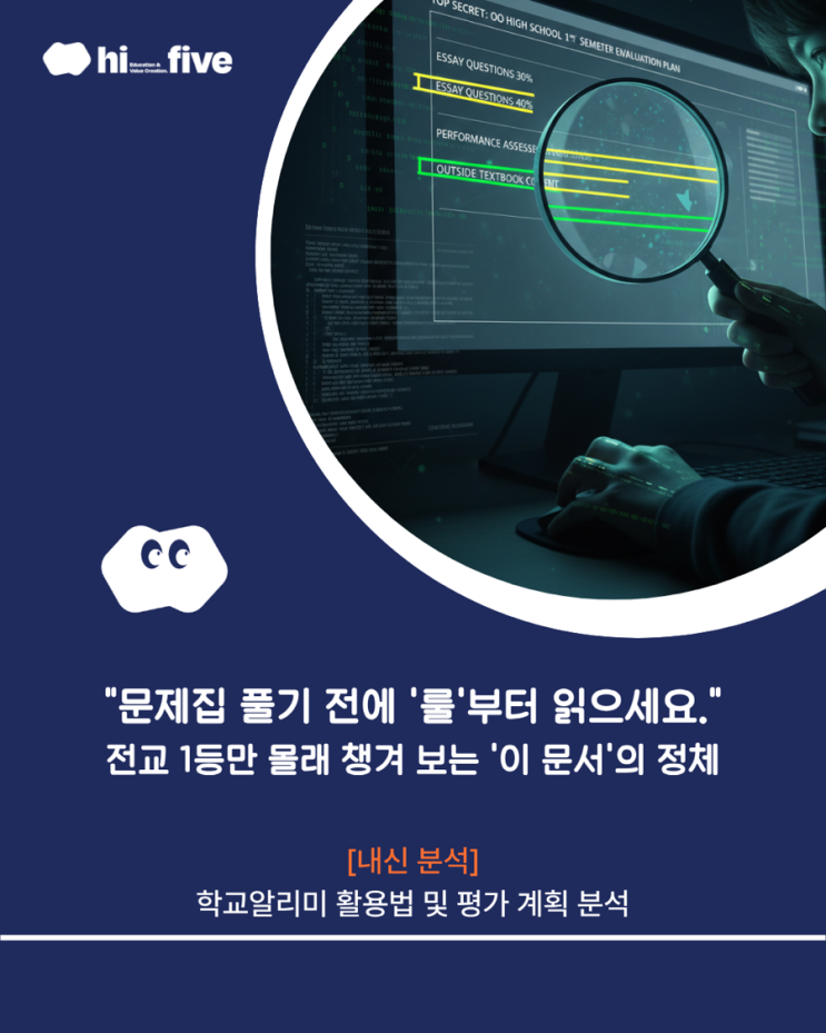 전교 1등만 몰래 챙겨보는 이 문서의 정체! 하이파이브가 밝힙니다! 안녕하세요. 하이파이브 원장 케인쌤 입니다. 어느덧 2월의 설날도 지나고 개학이 한걸음씩 가까워지고 있습니다. 이제 학년이 올라가고 환경이 바귈 것을 생각하면 의도치 않게 긴장감이 많이 생기실텐데요! 오늘은 계속되는 긴장 속 다가오는 학기와 학년을 어떠헥 보내면 좋을지에 대해서 알려드리도록 하겠습니다. ✏️✏️ 전교 1등만 몰래 챙겨보는 이 문서의 정체 ️ 학교 알리미 활용법 및 평가 계획 분석 새학기 무조건 서점으로 달려가 문제집을 사는건 그만! 이제 성적을 올리기 위해서는 학교의 평가 계획을 먼저 봐야 합니다. 하이파이브는 수많은 8학군....... <img src="https://blogthumb.pstatic.net/MjAyNjAyMTlfMjY4/MDAxNzcxNDY1NDQ2ODg0.Go0a_rxcMflNrM3XIwc1xuL2hj3NHrP1RpzKXQp-6j4g.j2J0PWMEMBNTSI0N7INwXgk9gyN66gikI6SnLgrVzf4g.PNG/IMG%A3%DF0775.PNG?type=s3" />