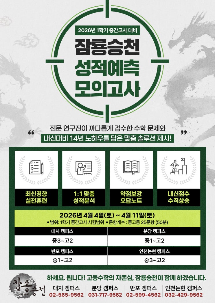 안녕하세요. 대치동 잠룡승천수학학원입니다. 2026년 4월 4일(토) ~ 4월 11일(토)까지 2026년 1학기 중간고사 대비를 위한 성적예측 모의고사를 실시합니다. 대상은 중3, 고1, 고2 전체 원생 시험 문항은 25문항, 시험시간은 총 50분입니다. (OMR 마킹 포함) 잠룡승천과 함께하는 꼼꼼한 대비로 1학기 중간고사에서도 좋은 성적을 받을 수 있도록! 모두 화이팅 입니다~ "하세요, 됩니다! 잠룡승천이 함께 하겠습니다." ☎ 상담문의 : 02-565-9562 <img src="https://blogthumb.pstatic.net/MjAyNjAzMjBfMjQx/MDAxNzc0MDAxNjAzMjE4.SXd3qKUtZ-Y3KoAiFu7-Kc1JJaA-IxVYEX_alA0Qhwkg.BZ4IAOb9kGGNxBB6LTzr0ZLvqN3DU1PfCHij4gSLvhIg.JPEG/b4_%C0%E1%B7%E6%BD%C2%C3%B5_2026_1%C7%D0%B1%E2%C1%DF%B0%A3%B0%ED%BB%E7_%C0%A5%BF%EB.jpg?type=s3" />