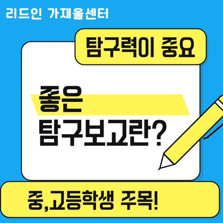 5등급제 시대에는 점수만으로 학생의 차이를 충분히 보여 주기 어렵습니다. 앞으로 더 중요해지는 것은 학생부 안에 드러나는 탐구력입니다. 학생이 무엇을 배우고, 어떤 질문을 만들며, 한 가지 주제를 얼마나 깊이 있게 파고들었는지가 더 큰 의미를 갖게 됩니다. 교육과정도 단순 암기보다 탐구 역량과 개념 기반 학습을 강조하는 방향으로 바뀌고 있습니다. 스스로 질문을 만들고, 배운 내용을 실제 문제와 연결하며, 한 주제를 깊이 탐구하는 힘을 보여 주는 방법이 바로 탐구보고서입니다. 그렇다면 좋은 탐구보고서는 어떻게 써야 할까요? 1. 생활 속 문제에서 시작합니다.좋은 탐구는 내가 실제로 궁금했던 문제, 자주 보던 현상, 불편했....... <img src="https://blogthumb.pstatic.net/MjAyNjAzMTZfMjM3/MDAxNzczNjY3MzE4MjYw.w66MJlAYxFqUrd7M0Y6eGJUPQFKPBm8SULrlt3lX8PQg.26zQcyvdeC1J4IuOsmGo4-wGJ8QT-qBtrhIVmTZ2kQMg.PNG/%C1%A6%B8%F1%C0%BB_%C0%D4%B7%C2%C7%D8%C1%D6%BC%BC%BF%E4._%2812%29.png?type=s3" />