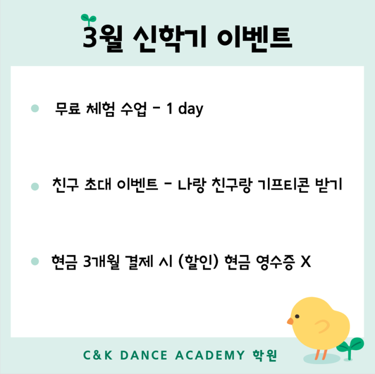C&K가 새학기 맞이 이벤트 준비했어요 ✨ 1일 무료 체험 수업 ✨ 친구 초대 이벤트 ✨ 3개월 등록 시 할인 혜택 이번 달이 시작하기 딱 좋은 타이밍이에요 상담만도 가능해요 편하게 문의 주세요 . . 기본기부터 탄탄한 춤과 체계적인 댄스를 배우고 싶다면 실용무용 입시전문 학원 C&K 댄스로 오세요 예고.대학 입시 / Black Queen's(공연활동 및 영상촬영 등)에 대한 상담 문의는 010-5686-3375로 연락주세요^^ #실용무용입시전문 #구미 #구미댄스 #구미댄스학원 #형곡동댄스학원 #구미케이팝 #구미kpop #구미왁킹 #구미코레오 #구미걸스힙합 #형곡걸스힙합 #구미왁킹 #cnkdanceacademy #구미팝업 #구미댄....... <img src="https://blogthumb.pstatic.net/MjAyNjAzMDJfOTMg/MDAxNzcyNDI5Njg5MTQy.kksbm-x7sE10dGvd7feETqXnNwg3S_fp78MKuNSL36kg.2QPjWagF1FfWj87tGntF7UZk-kxdK2kpxLTBOgQFt3gg.PNG/IMG%A3%DF5231.PNG?type=s3" />