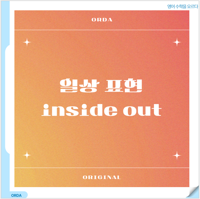 안녕하세요 오르다입니다. 이번 시간에는 일상 표현 inside out에 대해 알아보겠습니다. 기본 의미 1. 물리적 의미 inside out = 안이 밖으로 나오게 / 뒤집혀서 옷, 가방, 주머니, 장갑 같은 것들이 정상 상태가 아니라 속이 바깥으로 드러난 상태를 말합니다. He put on his T-shirt inside out. → 그는 티셔츠를 뒤집어 입었다. 2. 비유적 의미 inside out = 속속들이 / 샅샅이 / 아주 잘 사람, 장소, 규칙, 시스템, 책 내용 등을 매우 자세히, 완벽하게 알고 있는 상태를 말합니다. I know this town inside out. → 나는 이 마을을 속속들이 안다. 주의 사항 1. “속속들이 알다” 뜻일 때는 보통 know와 잘 어울린다 know ~ ins....... <img src="https://blogthumb.pstatic.net/MjAyNjA0MjBfMjAy/MDAxNzc2NjkzMjIzNzUy.g2qFTLwOL8AkvAxYfIHXOjiQdsOTLdDgI3C5CeTAPKUg.TlDEmBf1ZlgqIk7HGye-Bbyn8JhGa2qTM1nY_M6NdpIg.PNG/%C7%A5%C1%F6.png?type=s3" />