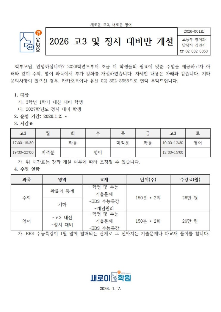 안녕하세요, 새로이학원입니다. 2026년 1월부터 고3 학생들을 위한 영어, 수학 수업이 시작됩니다. 수학은 미적분과 확률과 통계 두 과목이고, 미적분은 월요일 19:30~22:00, 목요일 17:00~19:30 확통은 화요일, 금요일 모두 17:00~19:30입니다. 영어는 한 반 개설되며, 수요일 19:30~22:00, 토요일 10:00~12:30 이렇게 운영됩니다. 영어, 수학 모두 1학기는 내신의 비중을 조금 더 높게 하고 2학기에는 정시에 집중합니다. 영어의 경우는 어차피 수능 연계되는 EBS 교재로 진행하기 때문에 내신과 수능 경계가 딱 나뉘지는 않습니다. 자세한 내용은 위 이미지를 참고하여주세요. 감사합니다~ <img src="https://blogthumb.pstatic.net/MjAyNjAxMDhfMjkg/MDAxNzY3ODQ3MzMxNDAw.Yf659IMtjdCcodCV0GRHbzUAA7B4Oxhx-G767V36YBIg.0nhcSHy3-1NpuLjYNb1l2TNVQ53h3OKDHU5T3gKFy-sg.JPEG/%28001%29_2026_%C1%A4%BD%C3%B4%EB%BA%F1%B9%DD_%B0%B3%BC%B3001.jpg?type=s3" />