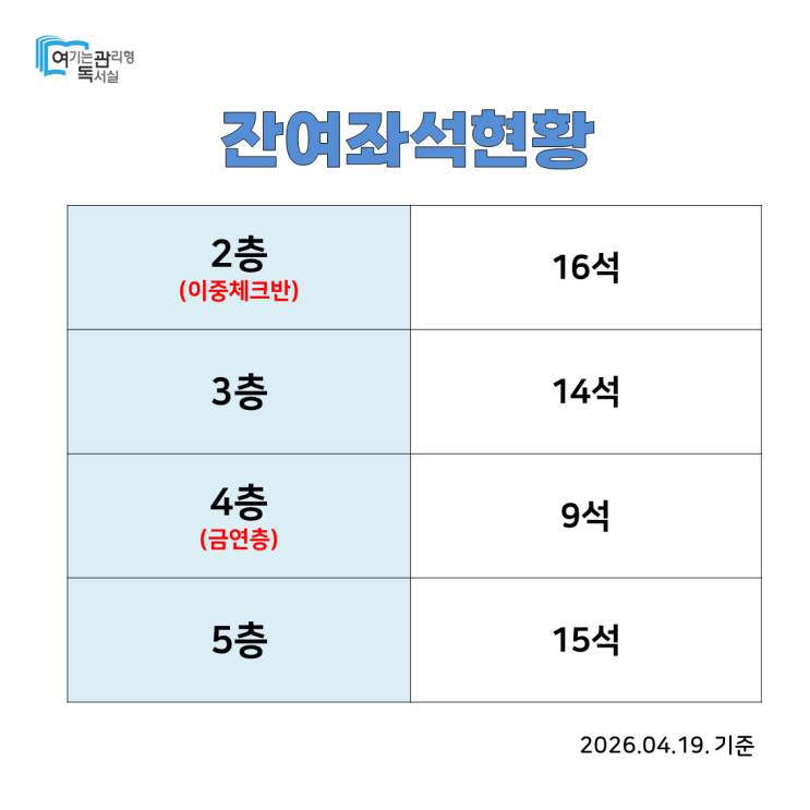 [대학동/고시촌/신림동 관리형 독서실] 4월 셋째주 실원 좌석현황 (잔여좌석 54석)