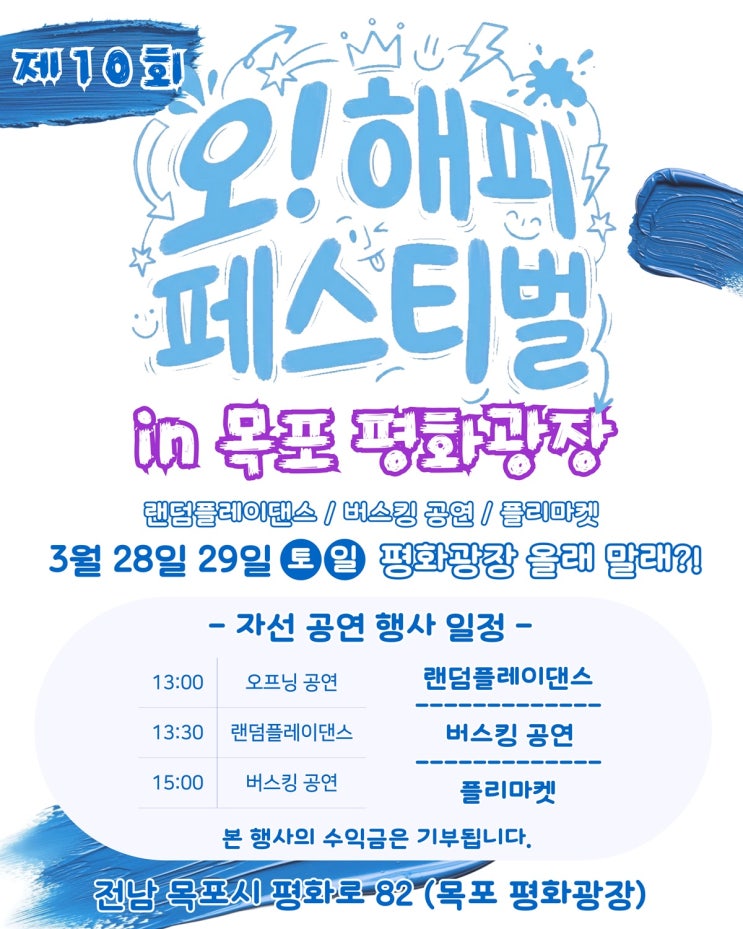 in 목포 평화광장 참가자 모집 중… ️ 좋아요는 "후원"에 동참입니다 ️ 제 10회 오! 해피 페스티벌은 시민 참여형 자선행사입니다. 재능 후원해주실 아티스티님들 모십니다. #목포평화광장 #오해피페스티벌 #목포공연 #목포버스킹 #목포랜덤플레이댄스 - 2026. 03. 28. 29 (토, 일) 13:00 - 전남 목포시 평화로 82 (목포 평화광장) 전국민 누구나 2026.03.01~2026.03.27 - 장르·실력 제한 없음 - 참가 신청 https://forms.gle/L9X7PQU82194tz2R8 - 노래 · 댄스 · 마술 · 악기 연주 등 - 참가 신청 https://forms.gle/GvskWfVQDxPdcrZf9 - 모집 부스: 플리마켓 / 푸드 / 체험 - 각종 다양한 마켓 입점 가능! DM @oh.happy_festival 01....... <img src="https://blogthumb.pstatic.net/MjAyNjAzMDlfMjM0/MDAxNzczMDQxNTc4MTY1._F9PY3c7XUYp3hWaPhhdO9bW4MD7vZ3hevLn_aJFCnYg.t0eRN-wvUxSVynqBRcO8n60m3TuDN9AbjyhTy8e8agMg.JPEG/202603041921478631151.jpg?type=s3" />