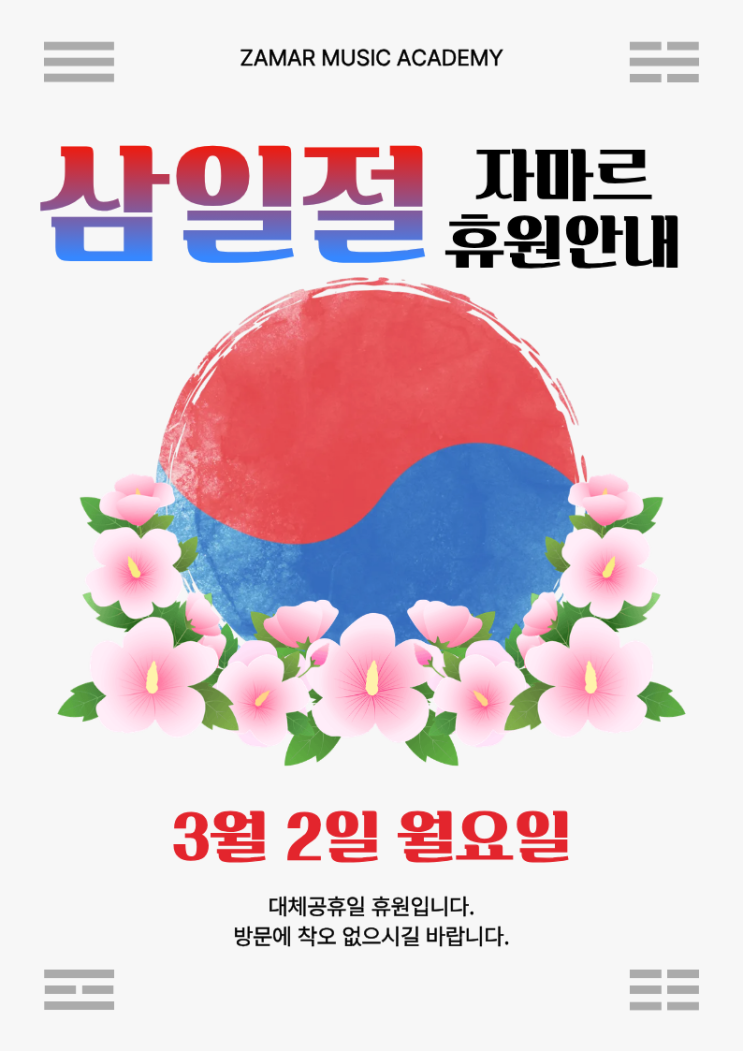 안녕하세요! 난곡/신대방/신림 실용음악학원 자마르 실용음악학원입니다 :) 이제는 정말 새학기 시작 바로 직전, 마지막 준비를 할 수 있는 시간이 얼마 남지 않았는데요!! 3월 1일은 우리 민족이 일본의 식민 통치에 맞서 독립선언서를 통해 대한독립을 세계에 알린 뜻깊은 날입니다. 삼일절의 의미를 되새기며, 새 학기를 시작하기 전 마음을 정비하는 시간을 갖고자 대체공휴일인 3월 2일까지 자마르 실용음악학원은 휴원하려고 합니다! 해당날짜의 수업은 보강수업으로 따로 진행이됩니다! 신학기라 수업시간에 변동이 많아 3월부터 보강수업 시간을 조율하려고 하니 조금만 기다려주세요~!! 이제 다음주면 시작되는 2026년 새학기! 우리 다....... <img src="https://blogthumb.pstatic.net/MjAyNjAyMjVfMjU4/MDAxNzcyMDIwODc4MTc3.s8eJ1XXx3cLEzDPmnDQKTEPSpFSPdOYfxDsD9yqE47sg.idg06wru2YwT5k0KIRNG6YATMdEN_eLqe_KrcNWG1acg.PNG/%C1%A6%B8%F1%C0%BB_%C0%D4%B7%C2%C7%D8%C1%D6%BC%BC%BF%E4..png?type=s3" />