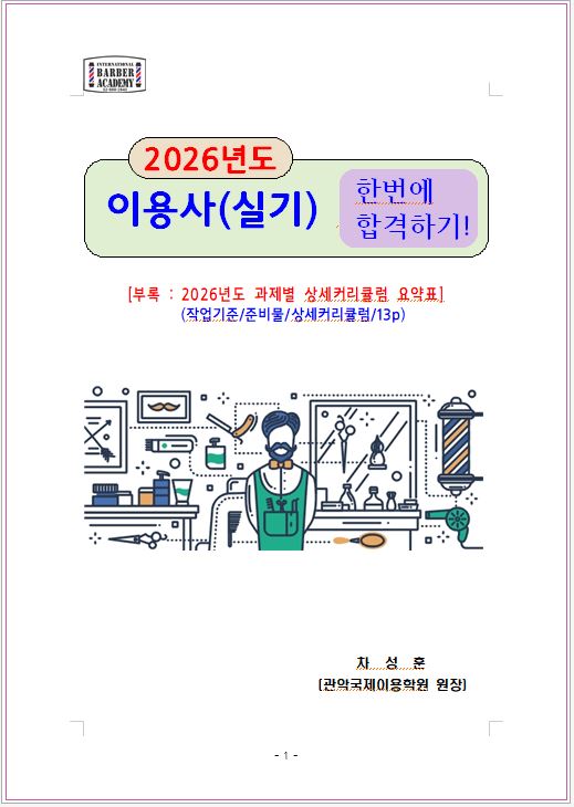 안녕하세요? 국가 기능사자격증인 이용사자격증 취득을 위한 전문교육학원인 관악국제이용학원입니다. 2025년도에 이어 올해 2026년도에도 전자책을 발간하였습니다. 책제목은 “2026년도 이용사(실기) 한번에 합격하기”(80쪽)입니다. 전년도와 작업내용에 변경이 없어서, 전자책도 내용상으로는 별 변동사항이 없습니다. 그래서 올해 2026년도에는 수험생의 시험준비 편의를 위해 의미있는 부록을 첨부하였습니다. 과제별로 작업기준, 준비물, 상세커리큘럼을 간략히 정리한 요약본(13 P)인데요, 시험직전 아주 효용있는 자료가 될 것입니다. 전자책의 내용은 전년도와 같이 수험생여러분이 이용사 실기시험을 준비하시면서 느꼈던 궁금한 내용....... <img src="https://blogthumb.pstatic.net/MjAyNjAxMjZfMTAz/MDAxNzY5NDA3MTc1MjQ1.tajcDDj7pBJxPKeIxMkRffr9erIjPYnLpFW0iecORJgg.fLqSOsfLvLp_4WTZ9RMHAWFF0L4KFTEaN_aJAPYbhOwg.JPEG/%C7%A5%C1%F6%28new%291.JPG?type=s3" />