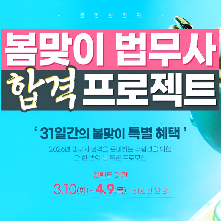 2026년 법무사 시험을 준비하는 수험생 여러분께 특별한 봄맞이 이벤트 소식을 전합니다. 지금 시작하는 수험생이 2026년 합격의 주인공이 될 수 있습니다. 단 31일간만 진행되는 특별 할인 혜택으로 합격 준비를 시작해보세요! 봄맞이 법무사 합격 프로젝트 ✔ 이벤트 기간 : 2026년 3월 10일(화) ~ 4월 9일(목) ✔ 대상 : 2026년 법무사 시험을 준비하는 수험생 지금 시작해야 하는 이유! 1️⃣ 1차 시험은 기본이 전부입니다 방대한 법무사 시험은 기초가 흔들리면 전체가 무너집니다. 지금 시작하면 1차 과목의 합격 기반을 탄탄하게 만들고 흔들리지 않는 합격의 뿌리를 만들 수 있습니다. 2️⃣ 2차 시험은 실전 훈련이 합격을 좌우합....... <img src="https://blogthumb.pstatic.net/MjAyNjAzMTFfMjA4/MDAxNzczMTk2MjM0MDc3.urmPv3V_wH-6IdbcwtgtYeK9daKSD4550qC6CwXI_ycg.S1_qWWQsNEkd7kv3kg0NNGgsrnu3V46X9BzGGo_NYiMg.PNG/%C1%A6%B8%F1%C0%BB_%C0%D4%B7%C2%C7%D8%C1%D6%BC%BC%BF%E4._%2831%29.png?type=s3" />