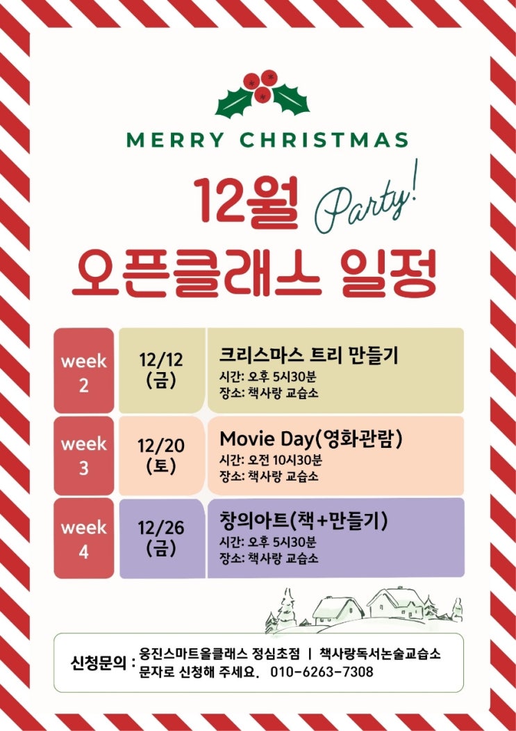 2025년 어느덧 마지막을 향해 달려갑니다 12월 정심초에서는 아이들과 소중한 추억을 쌓으려고 합니다 첫번째 행사로 크리스마스 트리만들기 여러가지 고민 후 요 크리스마스 무드등 만들기로 변경했어요 입구도 요렇게 장식해두고요 참 오며가며 달라진 점 찾으셨나요 바로 바로 방학특강 안내 배너 설치했어요 벌써 한자급수특강반 1타임 모집되었어요 서둘러 연락주셔요 다시 본론으로 돌아와서~~ 산타할아버지에게 편지도 써보고 한해동안 잘한일도 써보고 받고 싶은 선물도 써보고 산타할아버지의 역할을 부모님이 대신 해주신다는 비밀을 익히 우리 친구들이 알고 있네요 산타할아버지 진짜 계신다고 믿는 6세 친구의 마음을 잘 지켜주느라....... <img src="https://blogthumb.pstatic.net/MjAyNTEyMTRfMjcw/MDAxNzY1Njk5NDA0NTg3.jBieDZPMn5REoqJPe5SQNzVvl5r380G6PFs-XZ6yxB8g.qMxfAHoOeIeU3FshFA7SUnLd4usM7vvKgKNuPdVw-FEg.JPEG/900%A3%DF1765699385856.jpg?type=s3" />