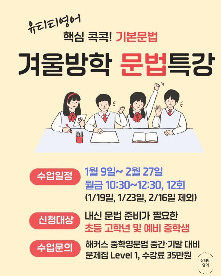봉천동 영어학원 유티티 영어 예비 중1 겨울방학 문법 특강 소개