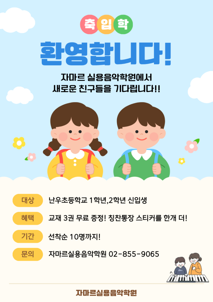 안녕하세요! 난곡/신대방/신림 실용음악학원 자마르 실용음악학원입니다 :) 짧았던 휴일이 끝나고 3월 3일이 지나, 새학기가 시작했는데요!! 새로운 마음으로, 설레는 마음으로 시작한 새학기를 맞이하여 자마르에서도 이벤트를 준비했습니다!! 자마르 신입생 환영 EVENT!! 처음 초등학교를 들어가는 학생들을 위해! 초등학교 1,2학년 신입생을 대상으로 자마르에서 특별한 혜택을 준비했습니다! ✨ 교재 3권 무료 증정!! 수업에 필요한 교재들. 첫 교재비에 대한 부담을 덜어드리기 위해! 3권을 무료로 증정합니다!! 칭찬통장 스티커를 한개 더! 자마르에서는 간식쿠폰,교재비쿠폰을 받을 수 있는 칭찬통장을 하고 있는데요!! 다른 학생....... <img src="https://blogthumb.pstatic.net/MjAyNjAzMDRfMzUg/MDAxNzcyNjI1NjQxODEy.7_eI_LQoIP04wm8dPyZVnLBWcC_kE1db6b7W7nAHUP0g.MfbtDhqFlldef4oqPPR5BkIV8GYOV_czPhVU2cmiZuQg.PNG/%C1%A6%B8%F1%C0%BB_%C0%D4%B7%C2%C7%D8%C1%D6%BC%BC%BF%E4..png?type=s3" />