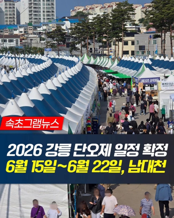 강릉최대축제, ‘단오제’ 일정이 확정 됐습니다 2026 강릉단오제가 6월 15일 ~ 22일 남대천 행사장 일대에서 열립니다. 올해는 무대공연예술 작품 총 17개 팀이 선정됐는데요. 국악·전통·디스코까지 전통과 현대가 어우러진 공연이 준비됩니다. 특히 공연 공모에는 무려 284개 팀이 지원하며 역대급 경쟁률을 기록했습니다. 또 축제의 또 다른 재미! ‘대한민국 창포주 선발대회’ 참가자도 현재 접수 중입니다. 접수: ~3월 10일 강릉의 대표 축제 올여름도 제대로 달릴 준비 중입니다 기간 : 6월 15일 ~ 6월 22일 장소 : 강릉 남대천 행사장 #강릉단오제 #강릉축제 #남대천 #강릉행사 #강릉여행 <img src="https://blogthumb.pstatic.net/MjAyNjAzMDZfNDYg/MDAxNzcyNzU1NDYyNTgx.GpgEphrL4lkGRq8fxCleY1bNITFZZS7_Iysm0HD69kYg.T7BXUH-Do8FYRDBmi-1eZ5wmc9TTCVwPf7rY8-4gxr4g.JPEG/900%A3%DFFB%A3%DFIMG%A3%DF1772755445305.jpg?type=s3" />