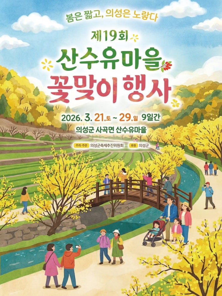 제19회 산수유마을 꽃맞이 행사 노란 산수유가 마을을 가득 물들이는 시간✨ 2026. 3. 21.(토) ~ 3. 29.(일) / 9일간 의성군 사곡면 산수유마을 따뜻한 봄바람 따라 노란 꽃길을 걸으며 의성의 봄을 가장 먼저 만나보세요 가족과 함께, 연인과 함께, 사진으로 남기기 좋은 봄 여행지 올봄, 의성에서 만나요! #의성군 #의성산수유 #산수유마을 #꽃맞이행사 #의성봄여행 <img src="https://blogthumb.pstatic.net/MjAyNjAyMjRfNDcg/MDAxNzcxOTEzNTM4OTA4.vhpBTZ9-C-O-RUeLnx0Bw6QiLujOFEj2WTeTuLqhQnQg.JjuWbmHaqcHkEZzy1zUGFuYMn5KRwBckkpd_pn_wUr4g.JPEG/900%A3%DFFB%A3%DFIMG%A3%DF1771913497008.jpg?type=s3" />