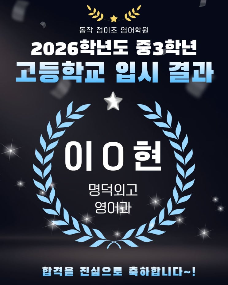 학부모님 안녕하세요~ 정이조 영어학원입니다. 오늘도 지난번에 이어서 2026학년도에 고등학교에 진학한 우리 중3 학생들의 인터뷰를 가지고 왔습니다~ 흔쾌히 인터뷰에 응해준 우리 중3 친구들 정말정말 감사합니다!! 중3 타이탄 H3 이 O 현 재원기간 : 22.8 ~ 25.12 (약 3년 5개월) Q1. 안녕하세요, 먼저 본인 소개 부탁드립니다. (학교, 입시 결과) 안녕하세요, 명덕외고 영어과 합격한 중대부중학교 3학년 이 O 현입니다. Q2. 이번 입시 결과에 대해서 예상을 했었나요? 명덕외고 말고는 다른 고등학교를 생각해 본 적도 없을 만큼 합격이 간절했기 때문에 꼭 합격해야겠다는 생각 밖에 없었어요. 저는 간절한 만큼 열심히 노력했기 때문에 꼭....... <img src="https://blogthumb.pstatic.net/MjAyNjAxMDZfMTA5/MDAxNzY3NzAyMjE4NzA2.2xaiN7_B0IJPbf4f4JxM6BIMYGRYnsVSw0DTQ-CAW9Ug.vWU_j--ffoOlXoznDWcnIpUL2zlE_sc-C2nSjdRmZWgg.JPEG/3.jpg?type=s3" />