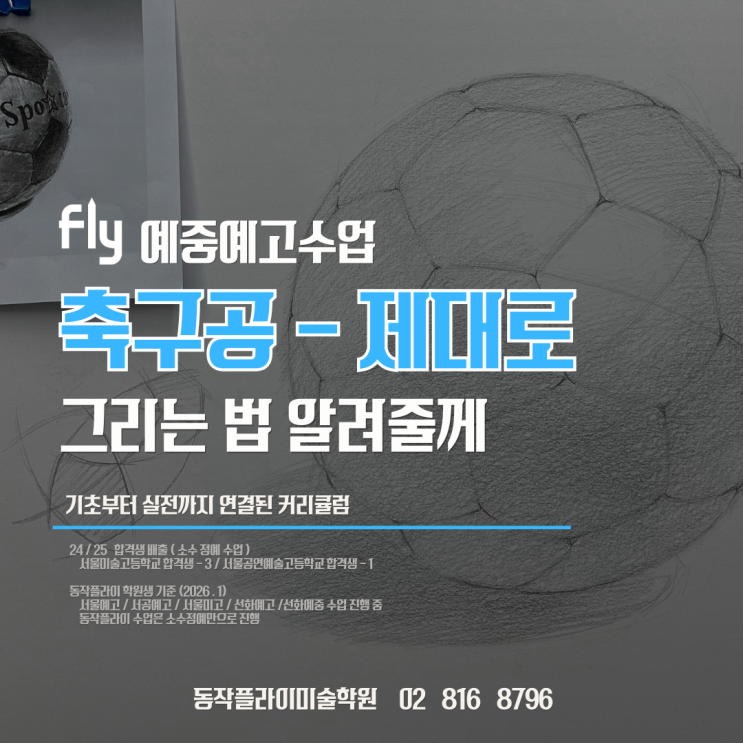 LET'S FLY WITH FLY 안녕하세요!! 동작플라이미술학원입니다 오늘은 우리 학생들이 수업 시간에 시범으로 함께 그려보았던 '축구공 소묘' 과정을 소개해 드리려고 해요. 축구공은 예중, 예고 입시에서 정말 단골로 등장하는 소재인데요! 학부모님들께서 보시면 "공 하나 그리는 게 뭐 그리 어려울까?" 싶으실 수도 있지만, 사실 이 안에는 미술의 핵심 원리가 다 숨어 있답니다. 아이들이 가장 많이 하는 질문, 선생님, 축구공은 도대체 어떻게 저렇게 입체적으로 그려지는 건가요? 에 대한 해답을 차근차근 풀어서 설명해 드리겠습니다 우리 아이의 그림 고민!! 기초부터 실전까지 전부 지도합니다!! 동작플라이미술학....... <img src="https://blogthumb.pstatic.net/MjAyNjAxMDhfMjAy/MDAxNzY3ODQ3ODEwNzg1.oDueAb0N8Ys9fyD7jpTmwvGbOpUqkwOEzzQonoy1vSkg.F5BNj0-vx6NRTnh91mWavjsZhjYs7-cc2jwwlEN9idcg.PNG/%BF%B9%C1%DF%BF%B9%B0%ED_%C3%E0%B1%B8%B0%F8.png?type=s3" />