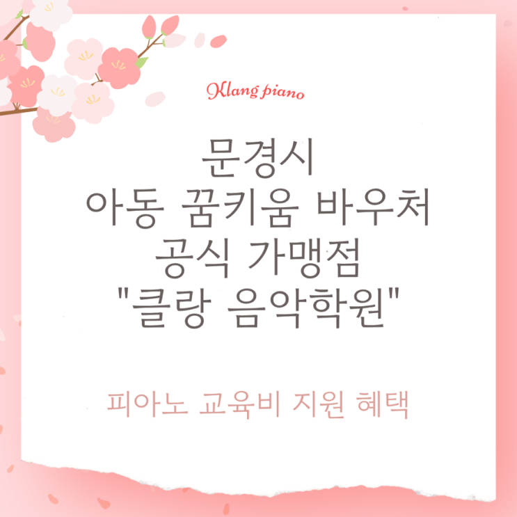 안녕하세요 클랑 음악 학원 원장 수민쌤입니다 우리 아이들 교육비!! 조금 부담이 되실 텐데요~!! 어머님들의 부담을 조금 덜어드릴 수 있는 지원 혜택! 안내드립니다!! 문경시 교육비 지원 혜택 사업 “문경시 꿈 키움 바우처” 공식 가맹점 클랑 음악 학원입니다. 지원 대상: 문경시에 주민등록을 둔 초등학교 4학년~6학년 지원 금액: 1인당 연 30만원 지원 지원 형태: 바우처 카드(일괄 충전식) 신청 방법: 관내 초등학교(17개교) 신청 접수 관외 초등학교 재학생, 학교 밖 청소년(주소지 행정복지센터) 우리 아이들의 배움에 있어 아끼지 않는 클랑 음악 학원이 되겠습니다 ◡̈ 상담 문의: 010.3325.6862 수업 중에는 전화 상담이 원활....... <img src="https://blogthumb.pstatic.net/MjAyNjAzMTZfMjQ0/MDAxNzczNjM3Nzc4OTQx.WjLMXcLxQ93qAmR4lgtI9ruZdV6NA-B3BBGhuK6weUEg.4r1b9n26tuZ62giB5jC5pnSS1xEW-wOUkfh8e9iR--wg.PNG/IMG%A3%DF8167.PNG?type=s3" />
