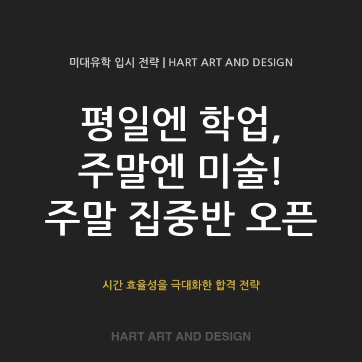 HART 유학미술 [유학미술] 안녕하세요, HART 유학미술입니다. 미국과 영국의 최상위권 미대가 요구하는 합격 포트폴리오는 하루 1~2시간의 쪼개진 시간으로는 절대 완성할 수 없습니다. 평일에는 학업 성적 관리 및 언어 공부에 온전히 집중하십시오. 탑 아트스쿨 입시에서 우수한 학교 성적은 결코 무시할 수 없는 강력한 무기입니다. 평일의 피곤한 상태로 학업과 실기를 어설프게 병행하는 것보다, 평일은 학교생활에 충실하고 주말을 완벽한 실기 몰입의 시간으로 완벽히 분리하는 전략이 훨씬 영리하고 확실한 합격의 길입니다. 눈앞의 대상을 집요하게 파고드는 '관찰 드로잉', 꼬리에 꼬리를 무는 아이디어를 시각화하는 '....... <img src="https://blogthumb.pstatic.net/MjAyNjAzMTZfMjQy/MDAxNzczNjUxMjE5MTkx.9ugskSfWqO5OnLRdGyB0azUY5VwkYzzuul0XP-43I-8g.qAq9_wYH2Bk2WjcJ4odUvGTmV_DPQ8jea3uZr0D0JsAg.JPEG/%C0%AF%C7%D0%B9%CC%BC%FA-%B9%CC%B4%EB-%C4%DA%B3%DA%C7%D5%B0%DD%C0%DB-%B0%C7%C3%E0-%C7%CF%B8%A3%C6%AE.jpg?type=s3" />