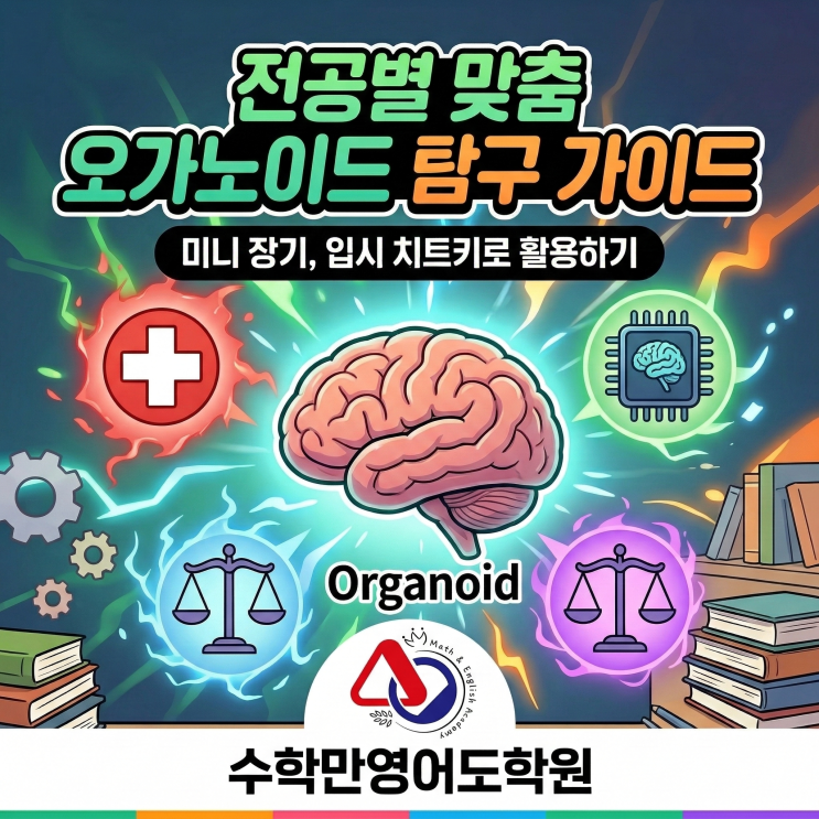 안녕하세요! 중·고등 영·수 전문, 수학만영어도학원입니다. 최근 입시 생기부(생활기록부)에서 가장 주목받는 융합 키워드는 단연 **'오가노이드(Organoid)'**입니다. 오가노이드는 줄기세포를 3차원으로 배양해 만든 **'장기 유사체(미니 장기)'**인데요. 환자 맞춤형 정밀 의료와 동물 실험 대체는 물론, 최근에는 뇌 세포를 연산 장치로 활용하는 '바이오 컴퓨팅(Bio-Computing)' 기술까지 등장하며 IT와 바이오의 경계를 완벽히 허물고 있습니다. 이 강력한 키워드를 학생들의 세특(세부능력 및 특기사항)에 어떻게 녹여내면 좋을지, 전공별 맞춤형 탐구 주제를 깊이 있게 정리해 드립니다. 1. 의약....... <img src="https://blogthumb.pstatic.net/MjAyNjAzMTBfODkg/MDAxNzczMTM0Mjg5NzUw.EJqhD0SnG0QubRUcemyF6fP-h0KfDKCufjskYyX7McUg._JAyZZXIQrK0YEYdK_R-bLGyIp9Ctth71_l6DrlKsIog.PNG/Gemini_Generated_Image_xi7ei8xi7ei8xi7e.png?type=s3" />