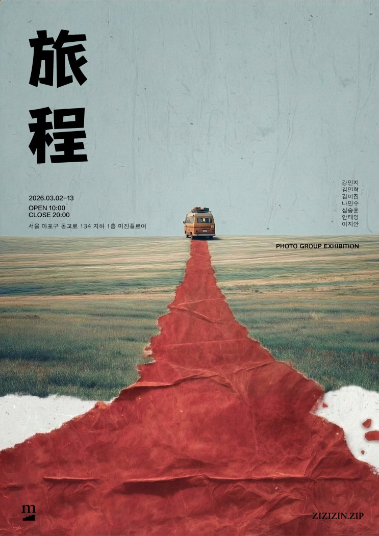 따뜻한 봄바람이 불어오는 3월, 바쁘게 흘러가는 일상 속에서 잠시 숨을 고르고 '나만의 길'을 돌아볼 수 있는 특별한 서울 사진전 하나를 추천해 드립니다. 바로 홍대 미진플로어 갤러리에서 3월 2일부터 진행되는 사진 그룹 전시 **《여정(旅程)》**입니다. 7명의 작가들이 각자의 시선으로 담아낸 삶의 흐름을 만나볼 수 있는 이번 전시는, 저에게도 아주 특별한 인연이 닿아있는 뜻깊은 자리이기도 합니다. 목적지가 아닌 '과정'에 주목하는 사진 전시, 《여정》 우리는 흔히 여행을 떠날 때 '어디로 갈 것인가'에 집중하곤 합니다. 하지만 이번 전시 《여정》은 여행의 최종 목적지가 아닌, 그곳으로 향하는....... <img src="https://blogthumb.pstatic.net/MjAyNjAyMjdfNDAg/MDAxNzcyMTg3NTQxODQ1.tSV_jCSWFolsRMdPwbASlFaDQDFm5f-BXg3n2mKxXYwg.QtQgWlz_3GsbCLAtQy3iWgVFG_swrP74n8iU93-mOLkg.JPEG/3%BF%F9-%BC%AD%BF%EF-%BB%E7%C1%F8%C0%FC-%C3%DF%C3%B5-%BF%A9%C1%A4-%C6%F7%BD%BA%C5%CD.jpeg?type=s3" />