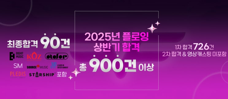 작년 한 해 2025년!! 플로잉 아카데미 학생들이 압도적인 합격 릴레이로 새로운 결과에 도전해 냈습니다. 작년 기획사 연계 학원 플로잉에서 진행된 오디션의 열기는 그 어느 때보다 뜨거웠습니다. 특히 2025 여름 연합 오디션에서만 플레디스(3건), KOZ(1건), ADOR(2건), YG(1건), 스타쉽(5건), 위에화(2건), 웨이크원(4건), A2O(4건) 등 내로라하는 기획사에서 1차 캐스팅을 이끌어내며 연합 오디션 1차 합격자만 총 400건 이상을 기록했습니다. 여기에 매월 진행되는 내방 오디션을 포함한 2025 전체 1차 합격자 수는 무려 726건에 달합니다. 이는 작년 한 해에만 900건 이상의 전체 합격수를 기록했던 플로잉의 탄탄한 저력이 올해도 변함없....... <img src="https://blogthumb.pstatic.net/MjAyNjA0MjlfMzIg/MDAxNzc3NDUxODkxMTMy.oHiazV0XcoldRYmW1fHuGV5gcKYUScXKcBww2n-cSosg.gcwflMqSpGmm51PojNiiNzGFvesA8oMANdNFlbw4k_Ug.JPEG/%C7%D5%B0%DD%C0%DA_6%B0%B3_%B9%F6%C0%FC_%C6%ED%C1%FD%BA%BB.jpg?type=s3" />