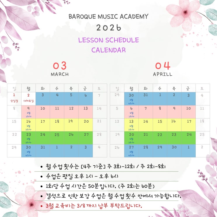 안녕하세요. 피아노 앞에서 당당한 #바로크음악교습소 입니다. 따뜻한 봄기운이 느껴지는 3월, 새 학기의 설렘이 가득한 계절입니다. 새로운 시작을 앞둔 우리 아이들의 발걸음을 응원하며 3월 수업 안내드립니다. 2026년 3-4월 수업 스케줄 3월 수업 첫날은 3/9부터입니다. 3월 첫 주는 2월 4주 차 수업을 진행하며, 3/1 삼일절 대체휴일로 3/2 수업은 휴강입니다. 새 학기에는 한 단계 더 성장하는 모습으로 함께 하겠습니다. 아이들의 음악적 자신감과 실력이 차곡차곡 쌓일 수 있도록 많은 응원 부탁드립니다. 피아노앞에서당당한바로크음악교습소 <img src="https://blogthumb.pstatic.net/MjAyNjAyMjhfMjU0/MDAxNzcyMjUxNjcwNjc1.ty0XfE5bW-mDowP0HKHfGux_QOv143ZybD-Q4uFnSJkg.2saXZnKG9_JNSCy94ab_PSW3TodUgthOGHjPpfQkPHsg.JPEG/3_4%BF%F9.jpg?type=s3" />