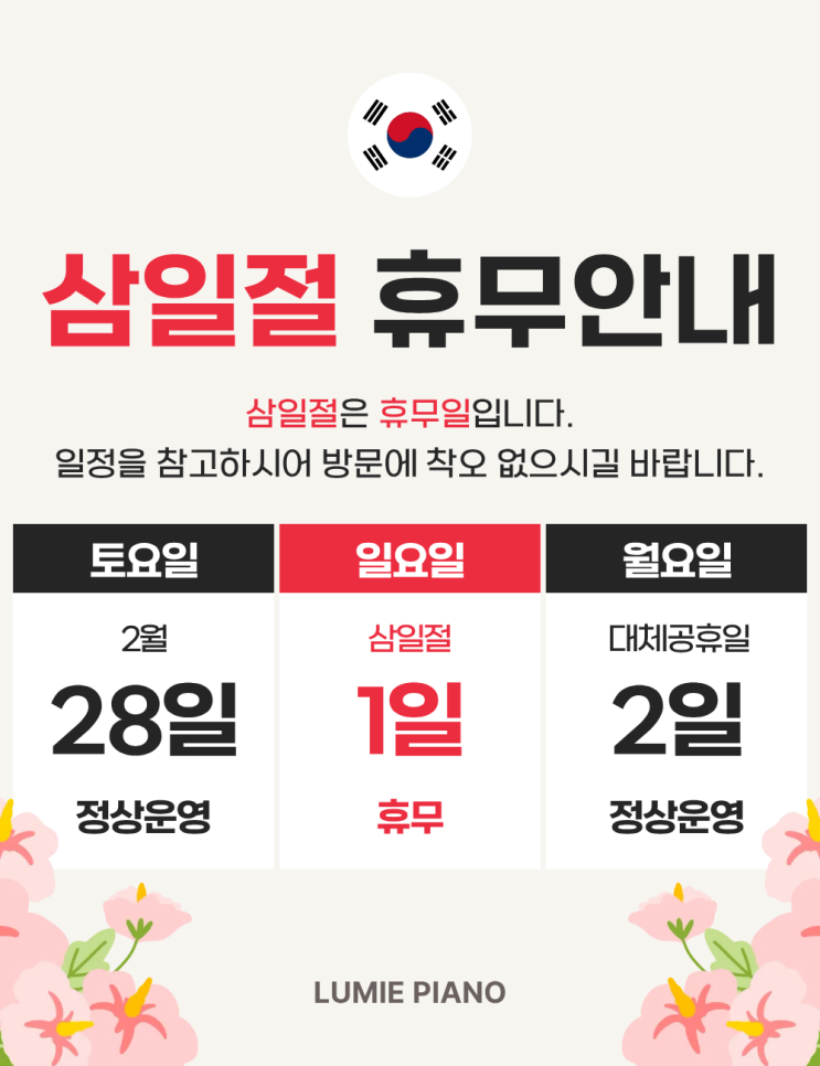 안녕하세요~ 삼일절 휴무안내드립니다:) 3월 1일 당일만 휴무입니다. 대체공휴일은 정상운영이니 참고하시어 방문해주세요~ <루미에피아노 상담 예약> ▼ https://linkfly.to/509139LdeHG 루미에피아노 강남역센터 OPEN 평일 10:00 ~ 22:00 주말 10:00 ~ 20:00 (법정공휴일 휴무) TEL:02-525-5172 <img src="https://blogthumb.pstatic.net/MjAyNjAyMTlfMjAx/MDAxNzcxNDg3MDk4NzU5.7hcuh_MW0fcl_Yg6GESL3ETzsQbd15nS076-je3oAk4g.eO15xzMuq_atHzrM6o1JjdwBzQ1qUCnsrLZ3l5JsAaIg.PNG/2026_%BB%EF%C0%CF%C0%FD_%C8%DE%B9%AB%BE%C8%B3%BB.png?type=s3" />
