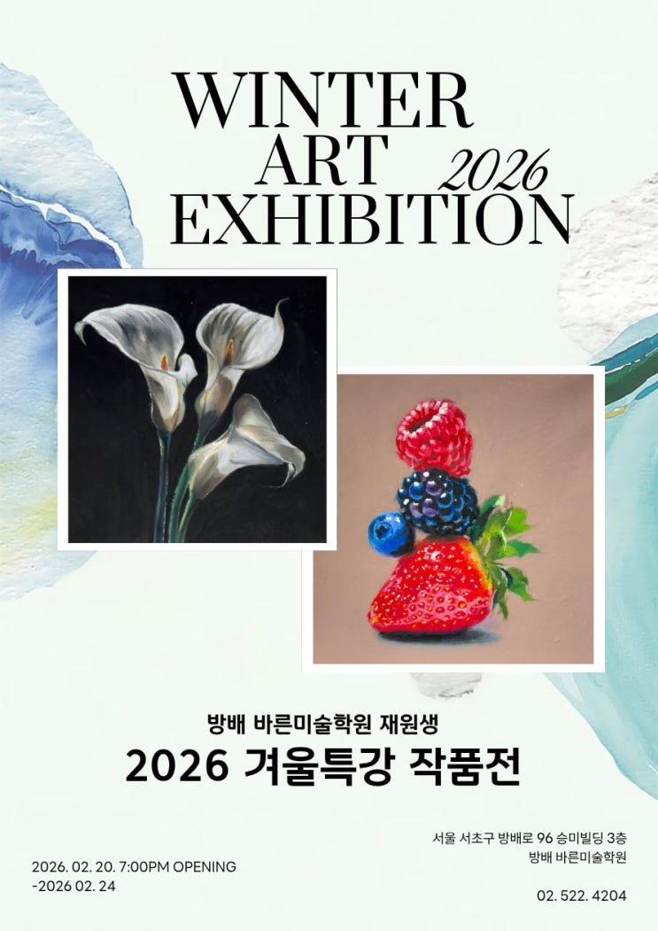 안녕하세요 예중예고입시전문미술학원 바른미술학원 방배캠퍼스입니다. 2월도 절반 가까이 지나며 열심히 달려왔던 겨울 방학 특강도 곧 끝을 향해 가고 있습니다. 유난히 추웠던 올해 겨울, 아이들의 뜨거운 열정으로 완성된 소중한 작품들을 모아 전시회를 개최합니다! 이번 전시에는 방배 바른미술학원의 모든 재원생이 참가했습니다. 기초부터 차근차근 배우고 있는 예비반 아이들부터, 그림그리랴 공부하랴 정신없이 바쁜 입시반 아이들까지... 옆에서 지켜본 선생님들은 아이들이 얼마나 고생하고 고민했는지 알기에 작품 하나하나가 너무 소중해서 가슴이 벅차올랐답니다 혼자 보기엔 너무 아까운, 우리 아이들의 '땀과 눈물(그....... <img src="https://blogthumb.pstatic.net/MjAyNjAyMTNfMTQ5/MDAxNzcwOTY0MDI0ODIw.cJbDDHucy1scxar1h7zMfAKTgF4oYtFW3tBHlVK4fxgg.t9A8o_54imfw4WL8xVDowb0BFtd7M04N-X9EiQgQ5l0g.JPEG/%C1%A6%B8%F1%C0%BB_%C0%D4%B7%C2%C7%D8%C1%D6%BC%BC%BF%E4._%2812%29.jpg?type=s3" />